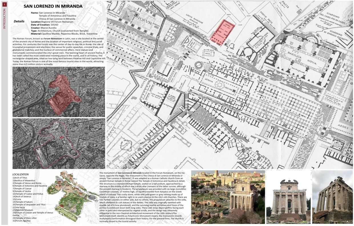 We completed all the technical details for the repair work to be done for the San Lorenzo in Miranda church in the Roman Forum, Italy. We delivered our project to the Municipality of Rome. The temple was constructed by the Emperor Antoninus Pius, beginning in 141 AD. The temple was converted into a Roman Catholic church, the Chiesa di San Lorenzo in Miranda, perhaps as early as the seventh century, but it is only attested from the eleventh century work Mirabilia Urbis Romae. Over time, with the changes in the ground the location of the original entrance of the church changed and was moved to the back. Our project is to reactivate the main entrance of the church.